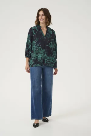 Blouse met lange mouwen A-shape Black/Green Painted Flower