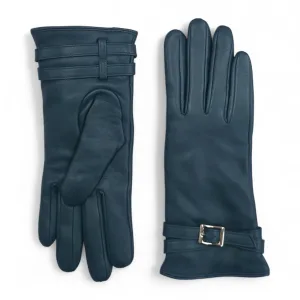 Dames winterhandschoenen met gesp en zachte wollen voering in Italiaans leer in blauwgroen