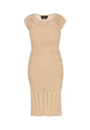 Mucho Gusto Zijden jurk lerici beige met slangenprint en kleurrijke broches