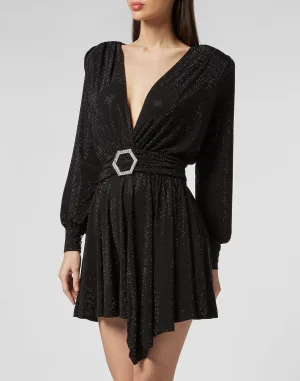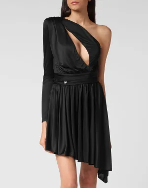 Gemonteerde jurk met blote schouders en kanten ruches
