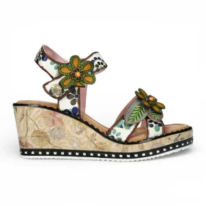 Laura Vita Ballon 08 damessandalen met sleehak, beige met bloemenprint, leer