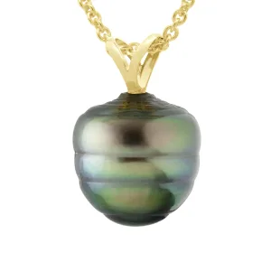 Beaded Pendant V Draad Geel Goud 750 en Echte GeCultiveerde Tahiti Parel Omgeven 9-10 mm