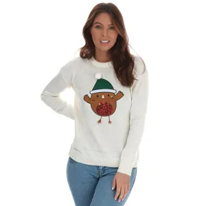 Brave Soul kersttrui met roodborstje voor dames, crème