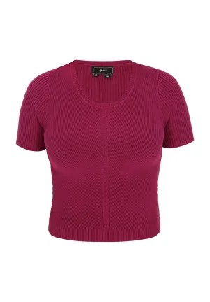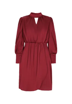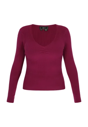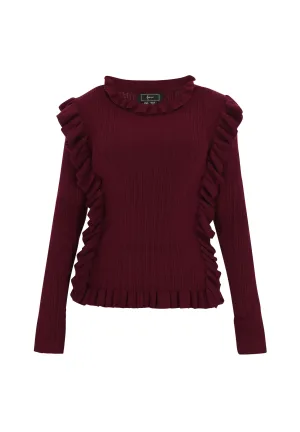 Bordeauxrode top met hoge hals, jersey en kanten lange mouwen