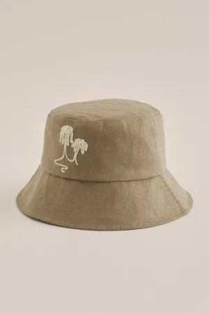 WE Fashion – Heren vissershoed met embroidery – Regular fit – Bruin – Linnen –