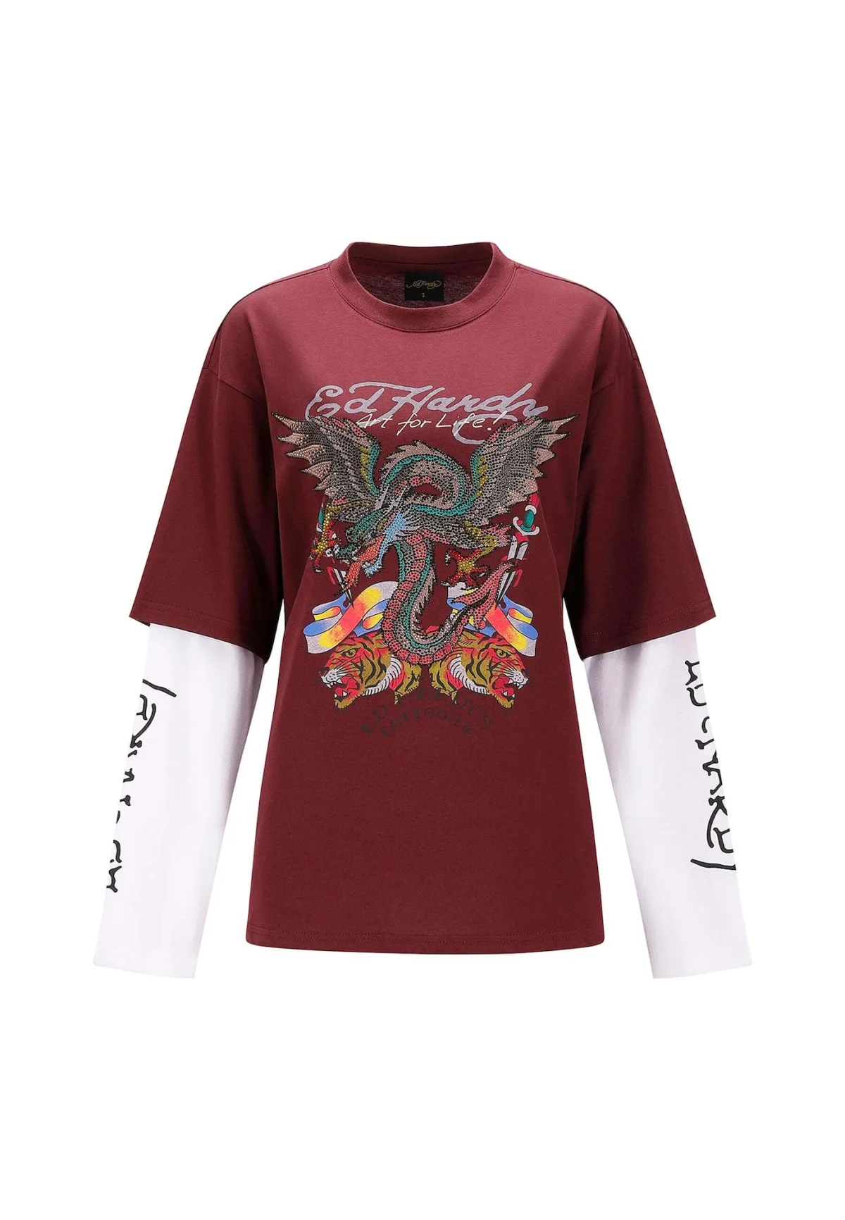 Watapparel Shirt ‘ Astronaut on T-Rex ‘ donkerrood / zwart / wit