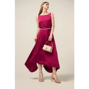 Oltre Long Satin Dress With Jeweled Belt Fuchsia