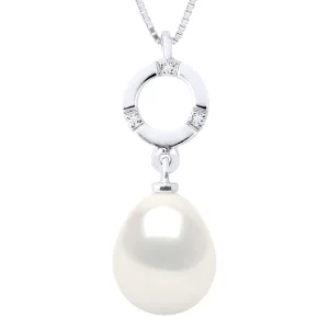 Halsketting Sieraden Diamant 0.01Cts Wit Goud en Echte Gecultiveerde Zoetwaterparel Peer 9-10 mm