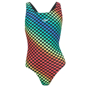 Girl’s Speedo Junior Allover Splashback Swimsuit in Black purple