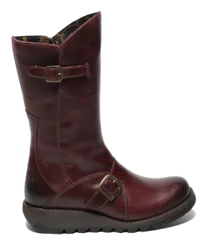 Fly London Dames Wijn MES 2 Wedge Heel Buckle Mid-Calf Leren Zip Platform Laarzen
