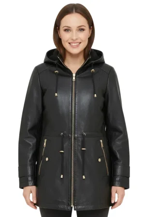 Zwarte leren parka voor dames met afneembare borg capuchon en trenchcoat – Emilia