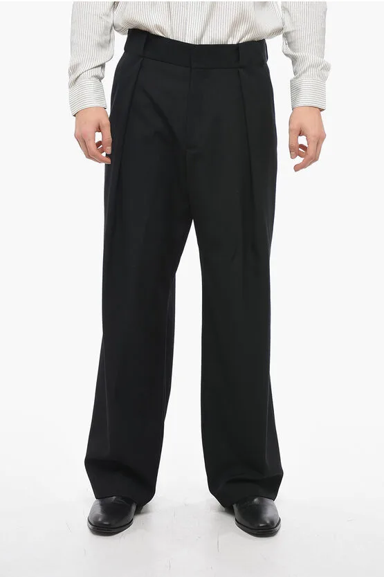Wollen wijde broek met plooien aan de voorkant in zwart