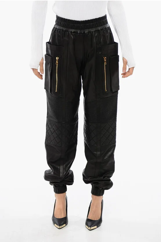 Leren broek met meerdere zakken en gewatteerd detail in zwart