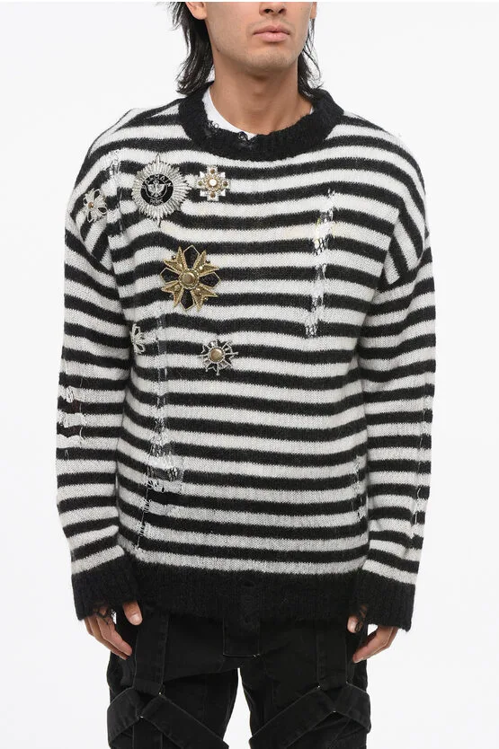 Gestreepte vintage-effect trui met ronde hals en decoratief patroon in zwart-wit