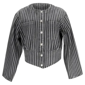 Chanel Gestreepte Button-Down Denim Jacket in Zwarte Katoen