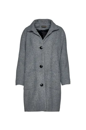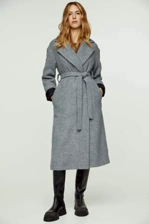 Lange wollen jacquardjas in neutrale tinten met ceintuur