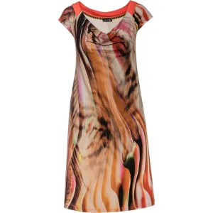 Mouwloze midi-jurk – abstracte rode print, transparant nylon mesh, volledig gevoerd met katoen