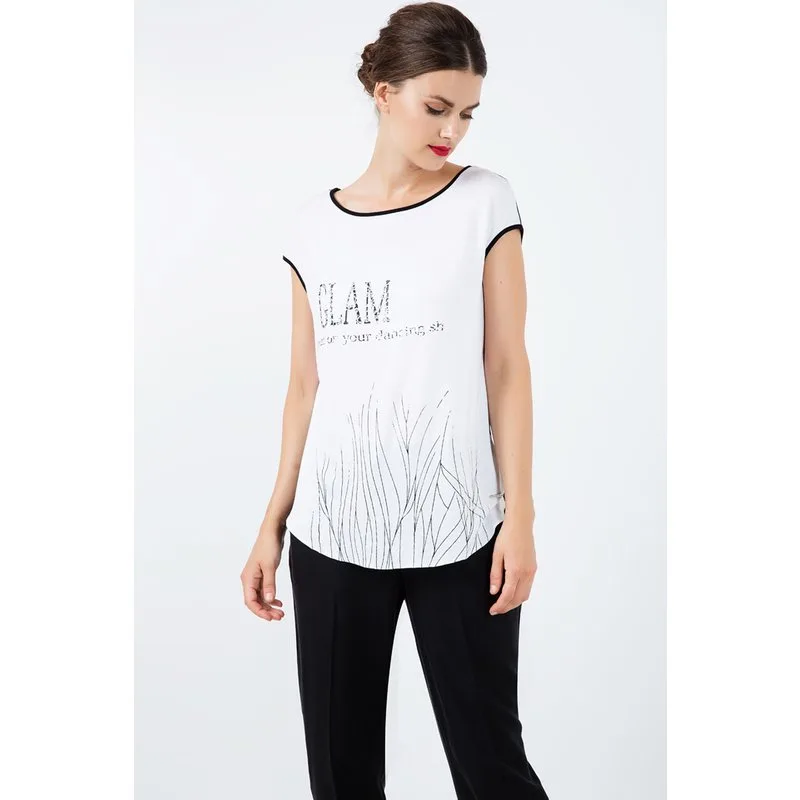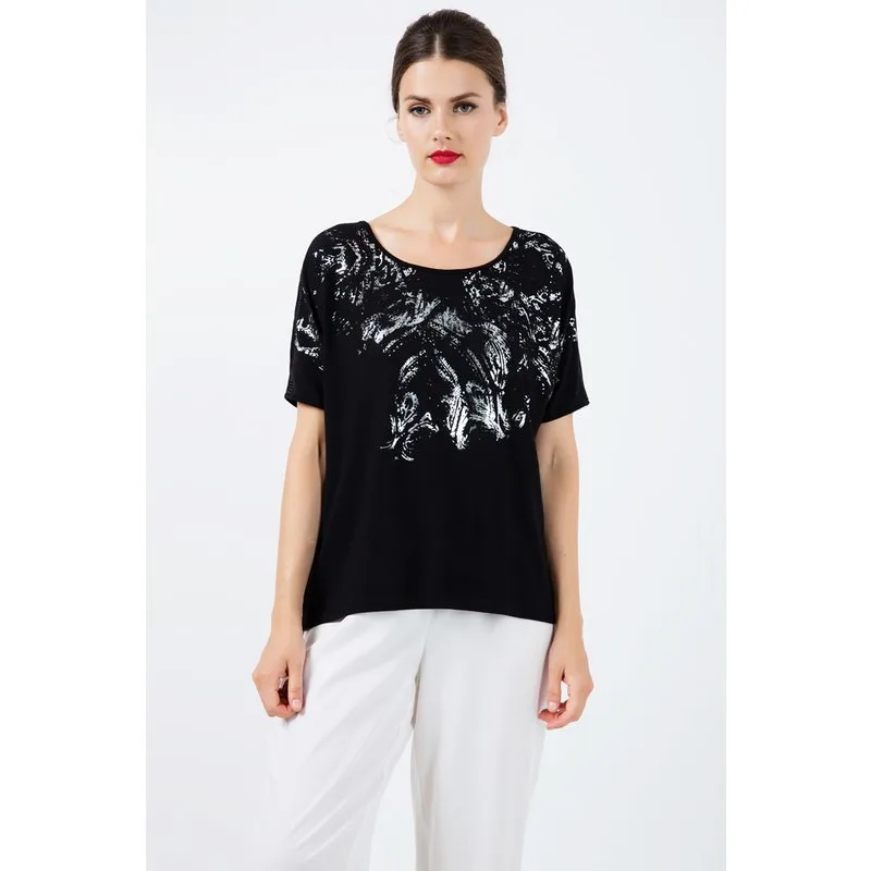 Zwarte top met korte mouwen en folieprint