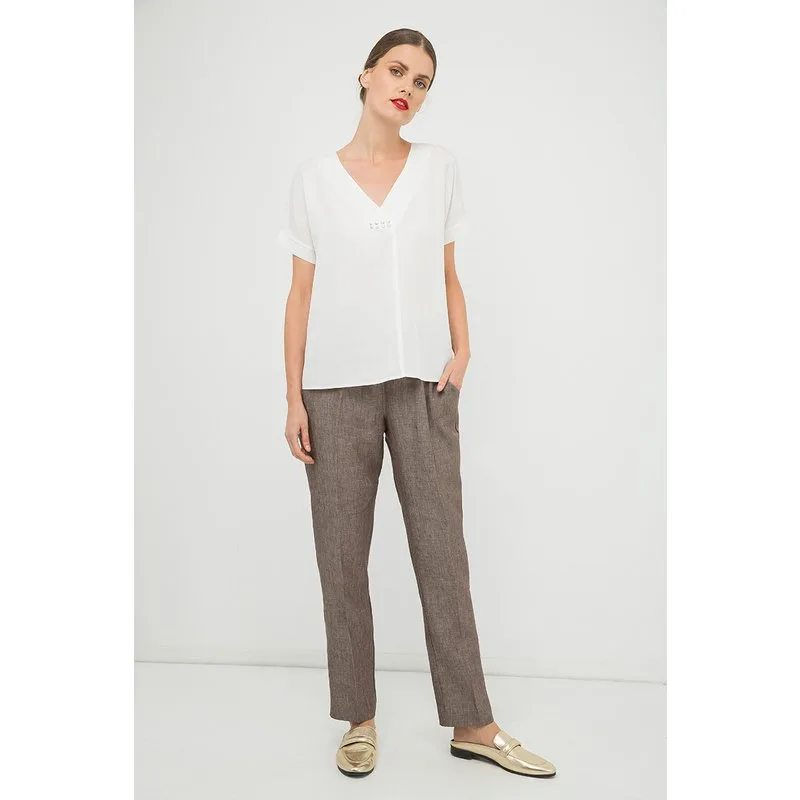 Crème V Hals Top met Metallic Motief