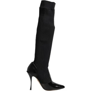 Dolce & Gabbana Zwarte Lederen Geribbelde Brei Knielaarzen Schoenen