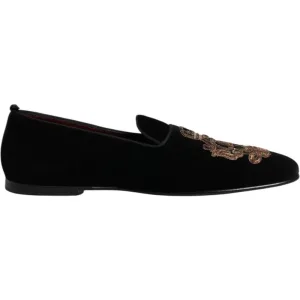 Dolce & Gabbana Zwarte Fluwelen Gouden Kroon Heren Instappers