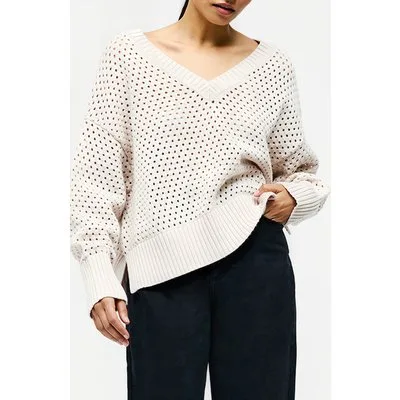 French Connection Crochet Knit V Neck Sweater Oatmeal