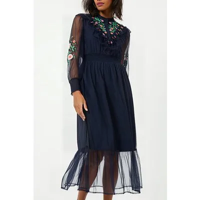 French Connection Abra Embroided Mesh Midi Dress Blue
