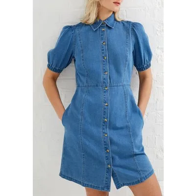 French Connection Chambray Puff Sleeve Dress Light Indigo