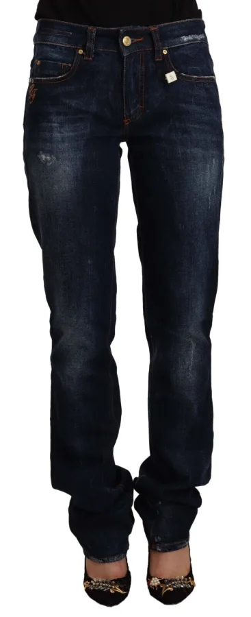GF Ferre Dames Donkerblauwe Washed Middelhoge Katoenen Denim Rechte Jeans