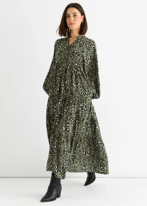 Khaki Viscose Dieren Oversized Smock Maxi Jurk
