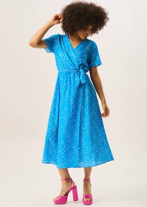 Marineblauwe maxi-jurk met col, afhangende mouwen en folieprint