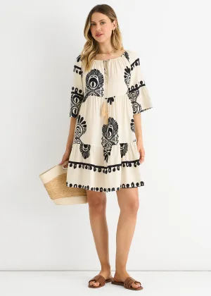Crèmekleurige Bardot-mini-jurk met uitlopende rok van viscose