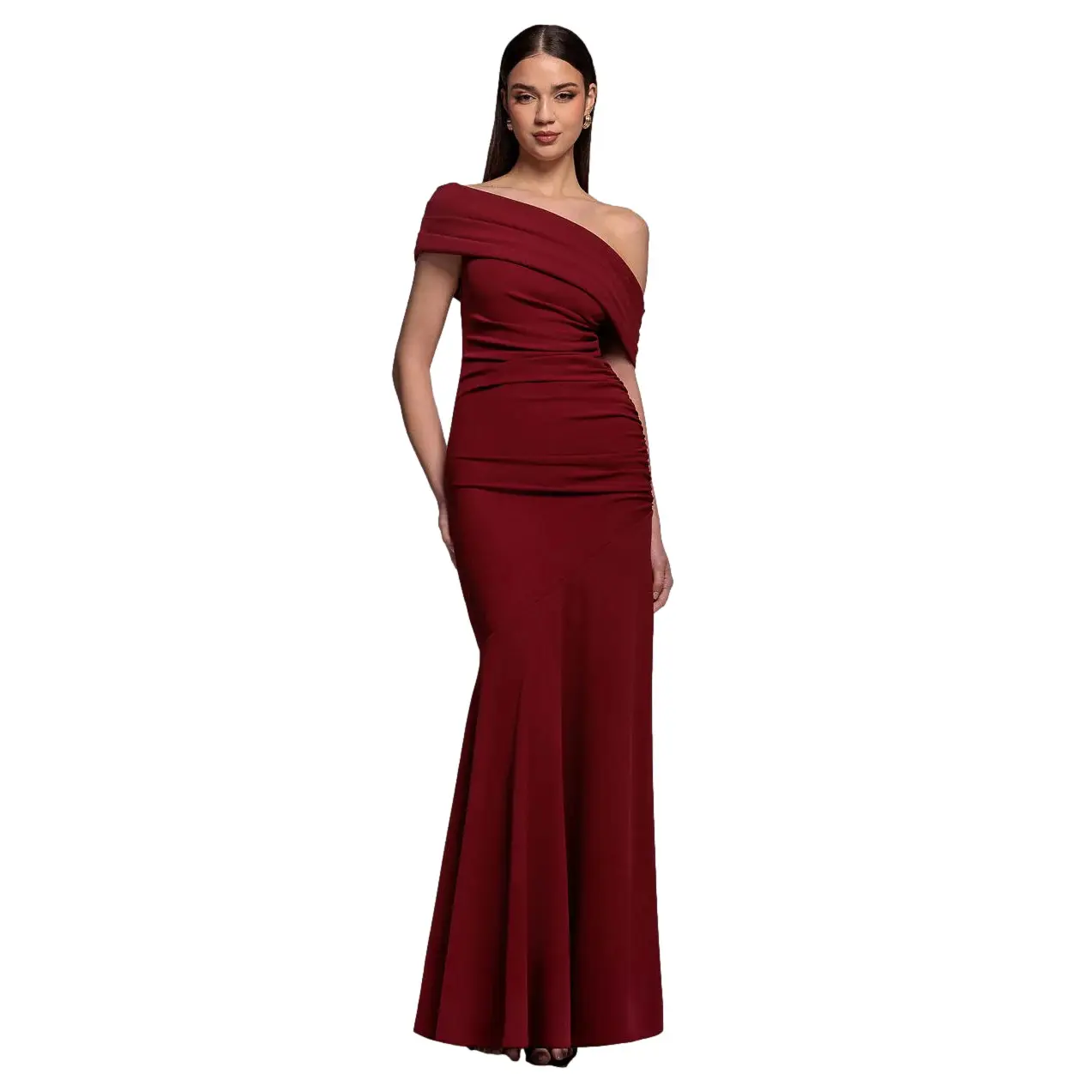Maxi Plissé Asymmetrische Aansluitende Bardot Schouderjurk voor Vrouwen Goddiva