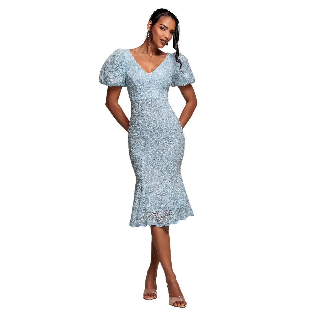 Midi Aansluitende Jurk Met Klokkende Mouwen Van Festonkant Dames Goddiva