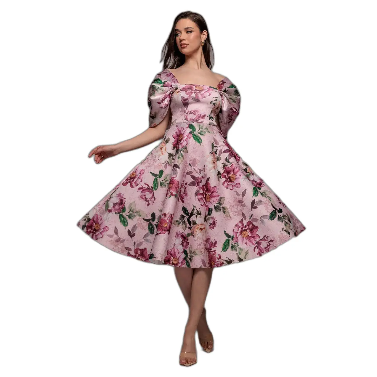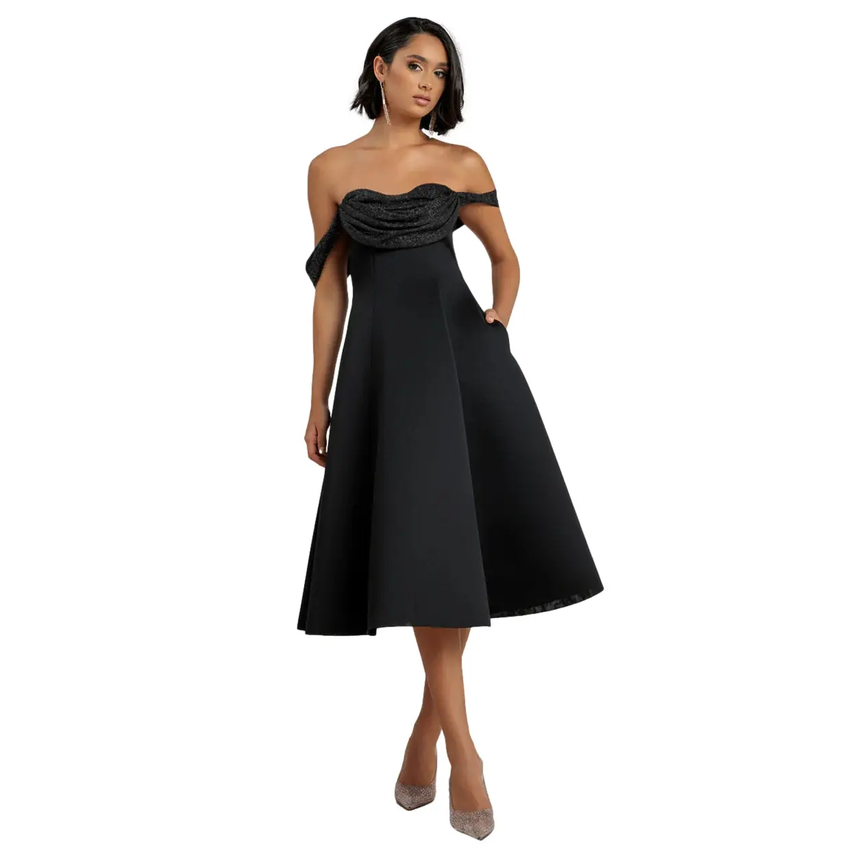 Trapeze jurk met blote schouders en bloemenstrik op de rug vrouw Goddiva Midi