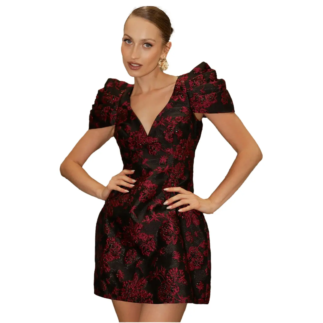 Vrouwelijke mini jacquard jurk met diepe V-hals en geplooide mouwen Goddiva