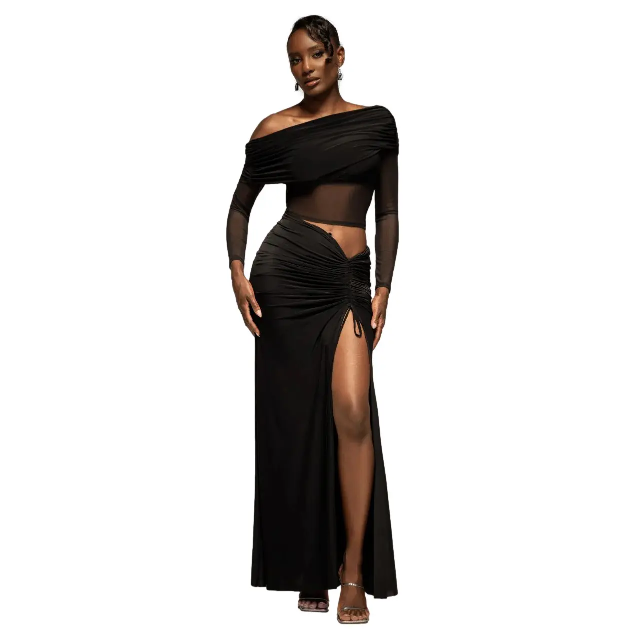 Asymmetrische lange bodycon jurk Bardot met ceintuur vrouw Goddiva