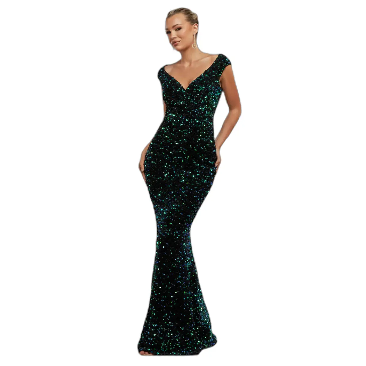 Lange damesjurk Goddiva Multi Sequin & Velvet Bardot