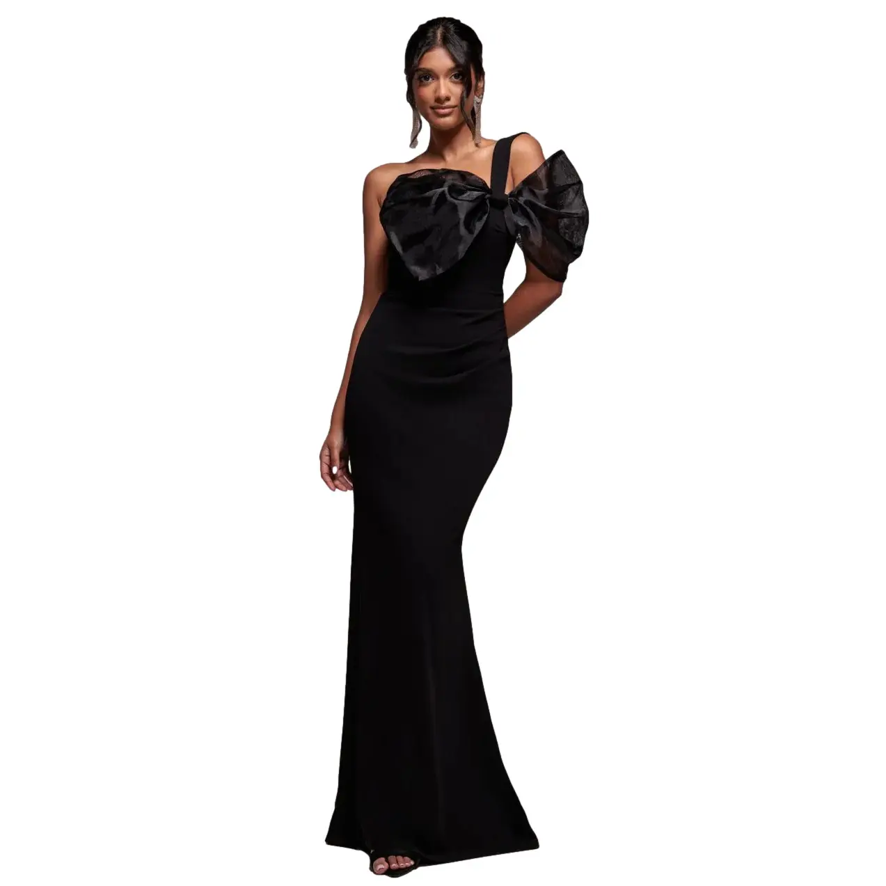 Trapeze jurk met blote schouders en bloemenstrik op de rug vrouw Goddiva Midi