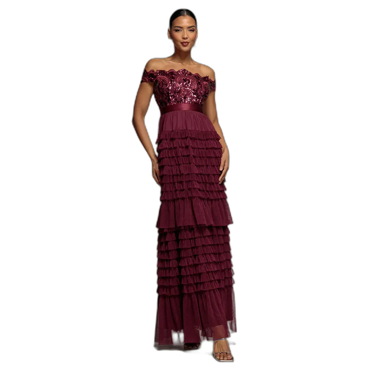 Lange damesjurk Goddiva Multi Sequin & Velvet Bardot