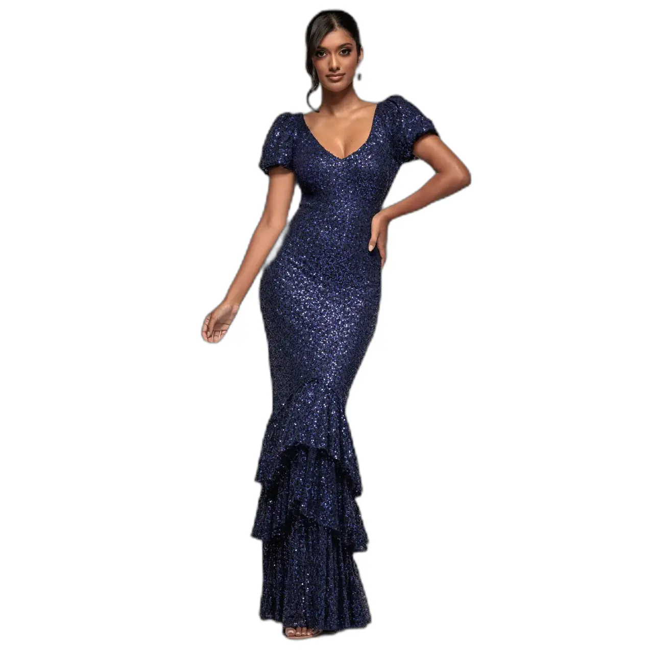 Lange damesjurk Goddiva Multi Sequin & Velvet Bardot