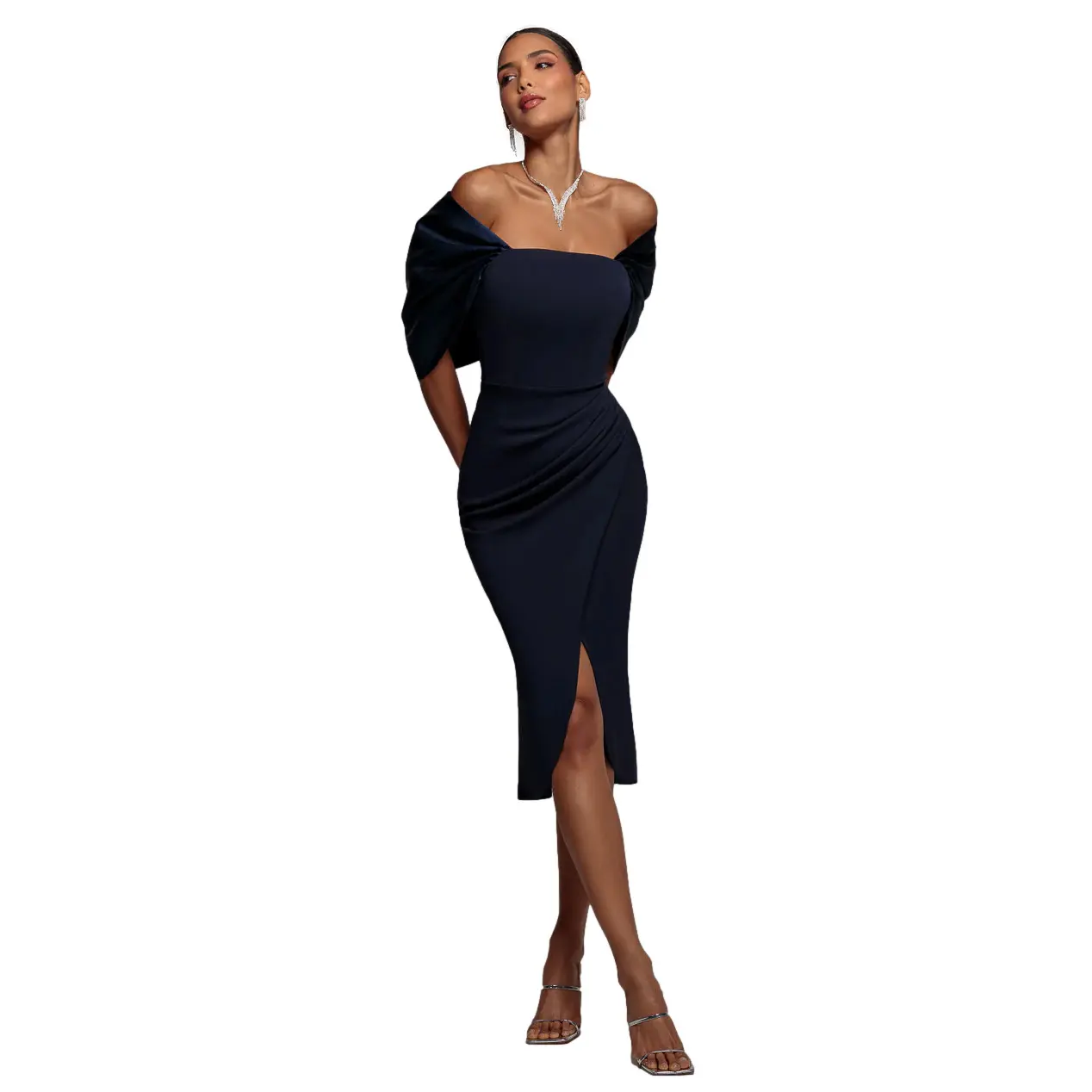 Glanzende en fluwelen strakke jurk, Bardot hals vrouw Goddiva