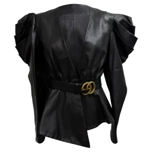 Gucci V-hals jasje met riem en pofmouwen in zwart leer