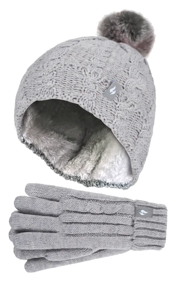 Heat Holders Meisjes Cable Bobble Muts En Handschoenen Set – Frost Gray Melange