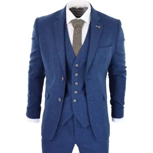 Heren 3-delig blauw tweed wollen twill vintage klassiek pak