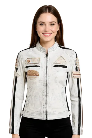 Dames wit leren bikerjack met racebadges – Dalby