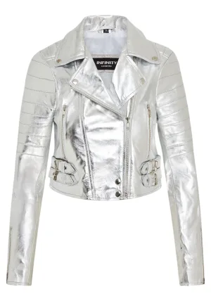 Dames zilveren cropped Brando leren bikerjack – Damascus