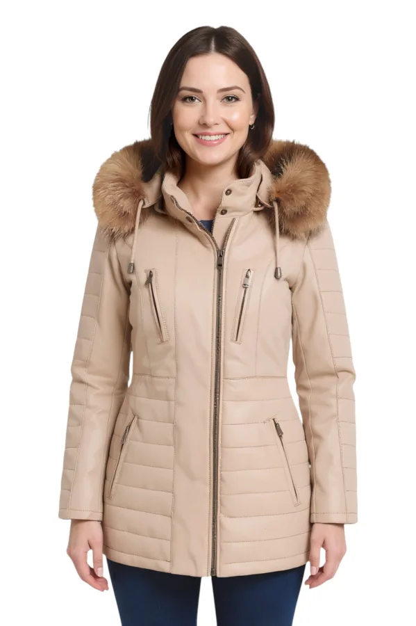 Groene leren parka voor dames met afneembare borg capuchon en trenchcoat – Emilia