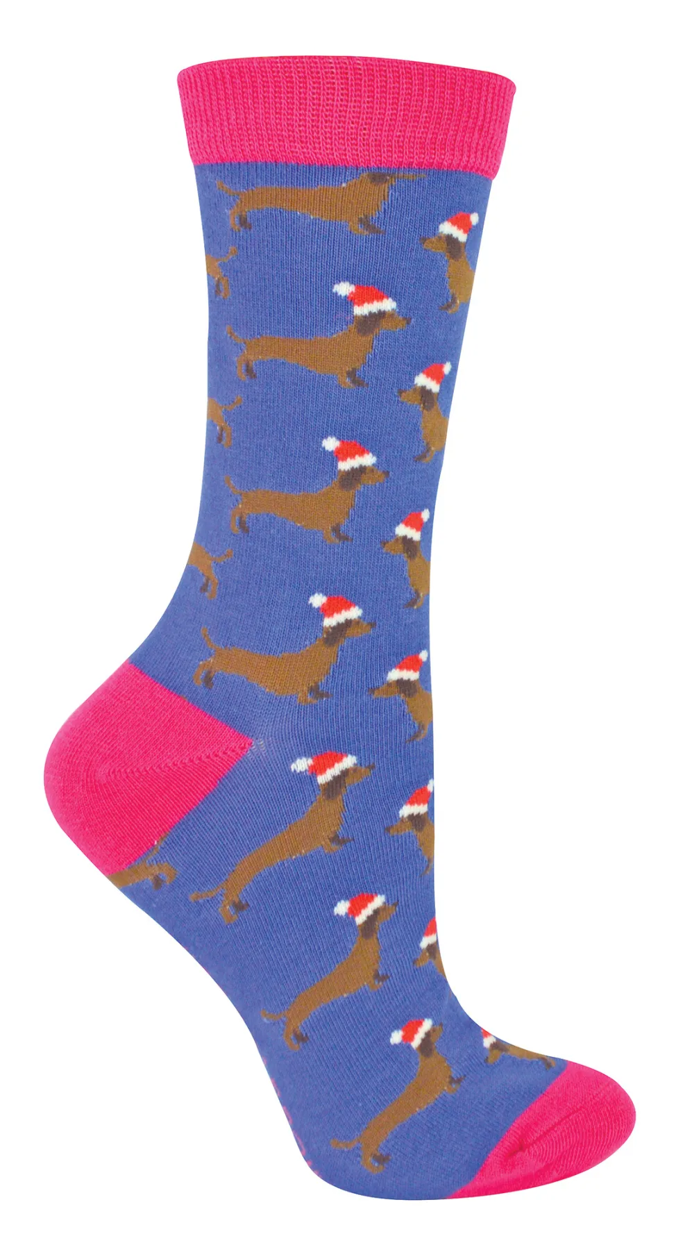 Miss Sparrow – 2 Paar Dames Kerst Sausage Dog Sokken, Sokken met Teckel Motief – Santa Dog (Denim)