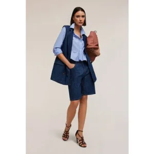 Motivi Double-breasted Oversized Waistcoat In Linen-blend Denim Blu